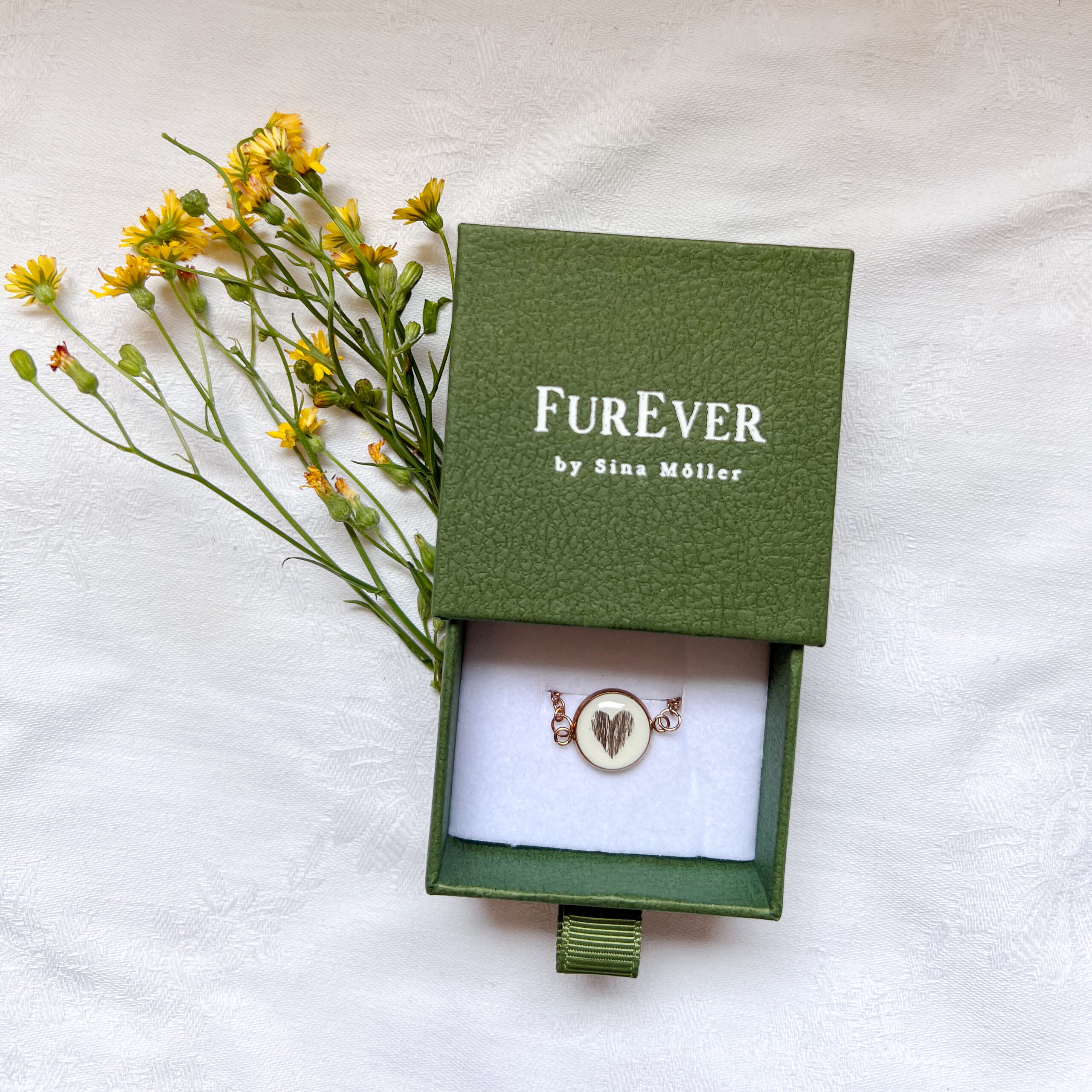 Jedes Furever-Armband wird liebevoll von Hand gefertigt und ist ein echtes Unikat. Da jedes Tierfell in Farbe, Struktur und Dichte unterschiedlich ist, kann das fertige Schmuckstück in Farbton, Muster oder Helligkeit von den Abbildungen auf der Webseite abweichen.